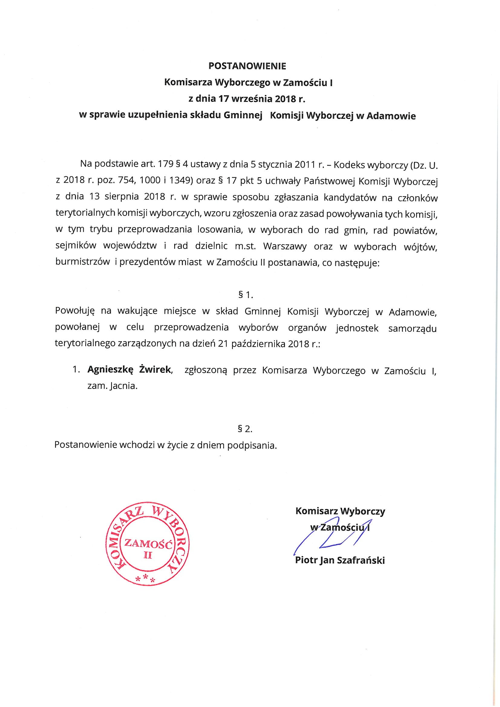 Postanowienia Komisarza Wyborczego z dnia 28 września 2018 r.